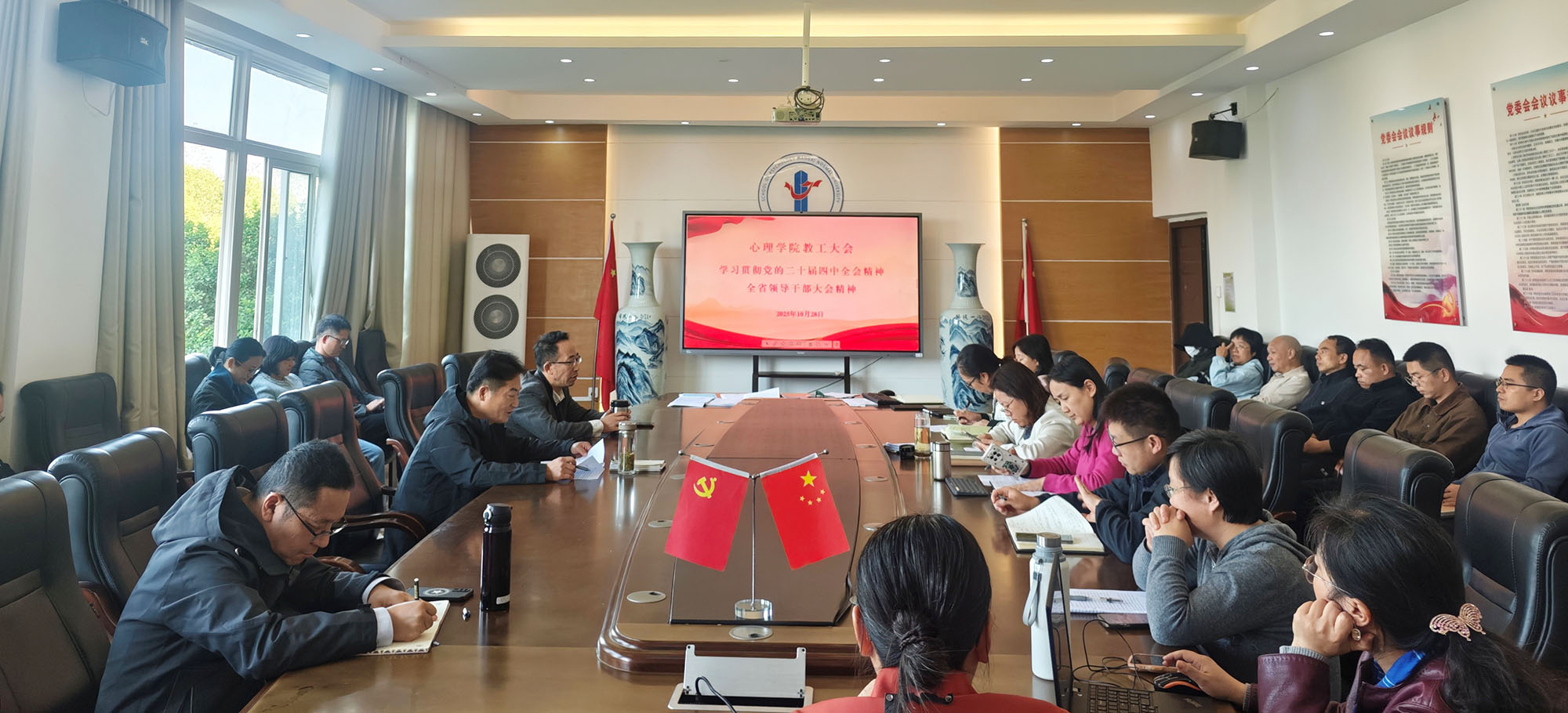 10月28日,心理学院召开党委会、教职工大会,专题传达学习贯彻党的二十届四中全会精神和全省领导干部会议精神。