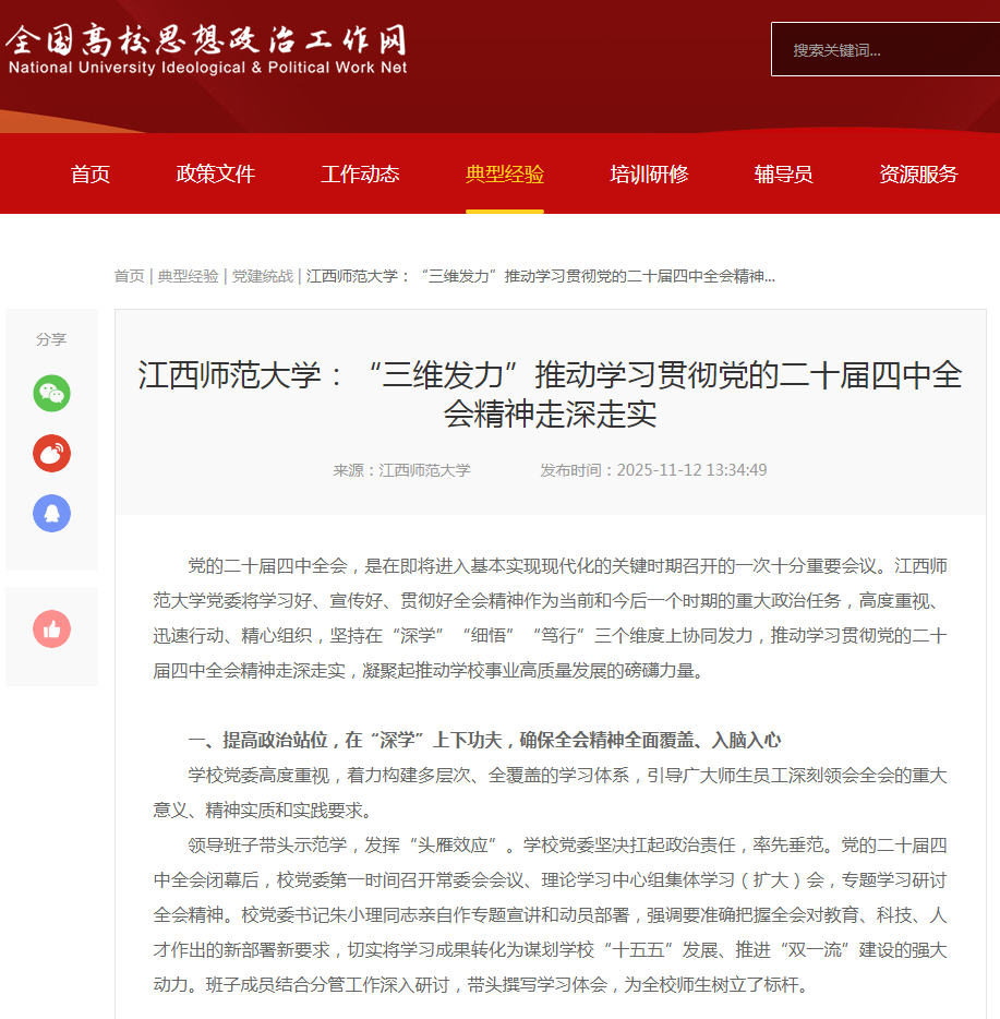 近日,全国高校思想政治工作网以《江西师范大学:“三维发力”推动学习贯彻党的二十届四中全会精神走深走实》为题,全文刊发并重点推荐我校学习贯彻党的二十届四中全会精神的特色做法与显著成效。该报道系全国高校思政网发布的第一条关于高校学习贯彻党的二十届四中全会精神的典型经验报道。