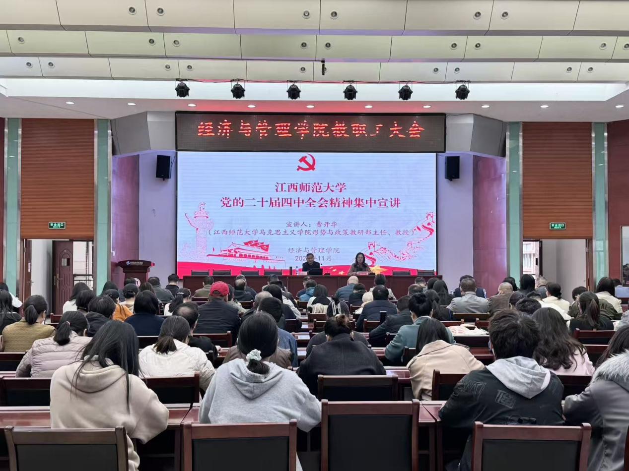 根据学校统一安排,11月11日下午,经济与管理学院在名达楼6301东报告厅组织开展党的二十届四中全会精神集中宣讲。马克思主义学院形势与政策教研部主任曹开华来院作专题宣讲报告。学院党政班子成员、全体教职工和本硕博学生代表共计180余人现场聆听。