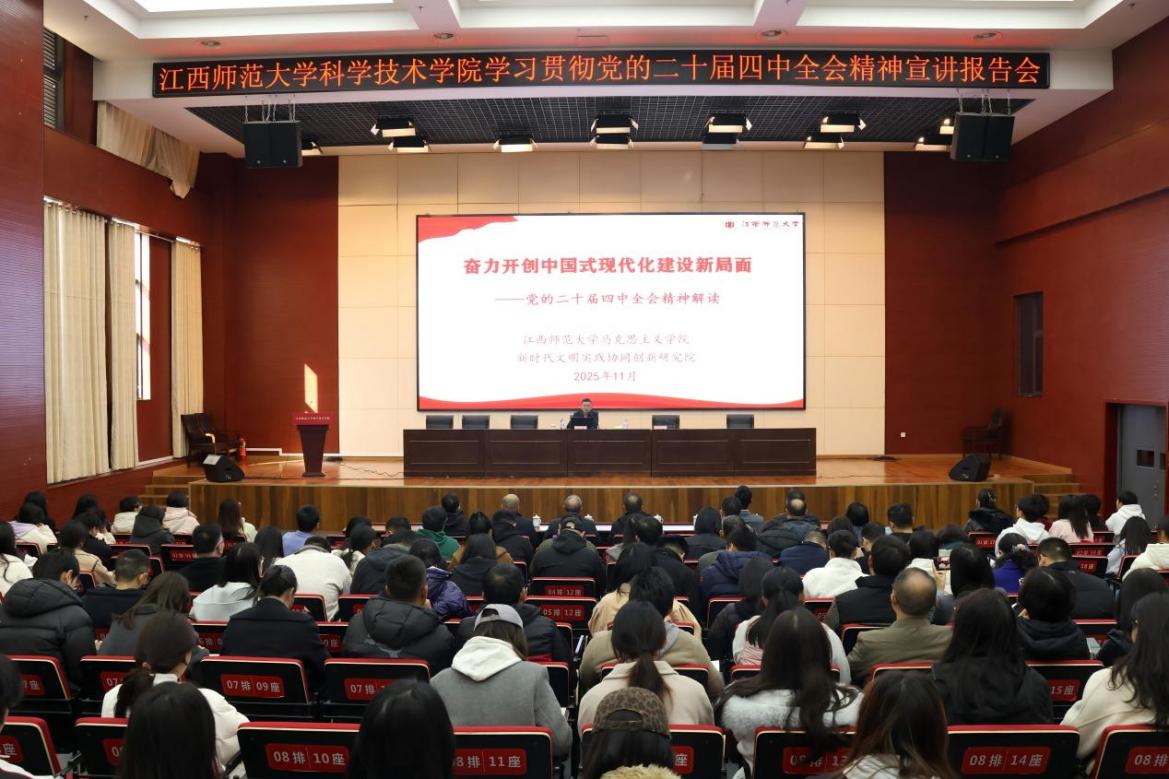 根据学校党委统一部署,11月18日下午,学习贯彻党的二十届四中全会精神学校宣讲团报告会在科技学院图书馆报告厅举行。学校宣讲团成员、马克思主义学院教师张业振博士作专题宣讲报告。科技学院在家学院党政班子成员,党政管理部门及各教学院党政主要负责人、各党支部书记、思政课专兼职教师与学生代表现场聆听。